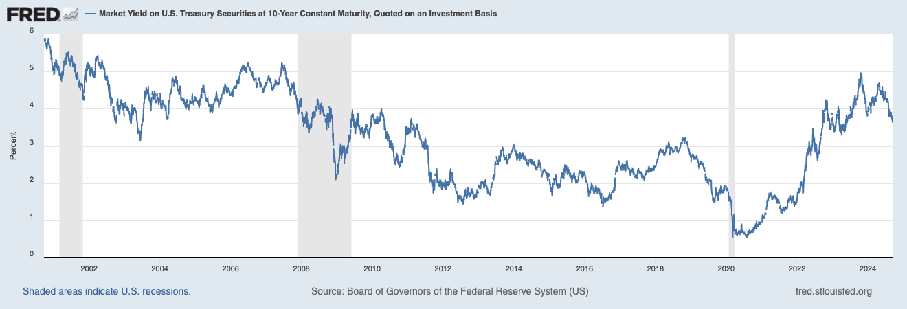 Since 2008, we’ve gotten used to unusually low interest rates, in historical terms. The 10-year Treasury yield fell to as low as 0.52% in 2020, during the peak of pandemic uncertainty. Today, the yield is around 3.7%, which seems high by recent standards but is relatively normal if we look at pre-2008 levels, when yields were often in the 4-6% range.