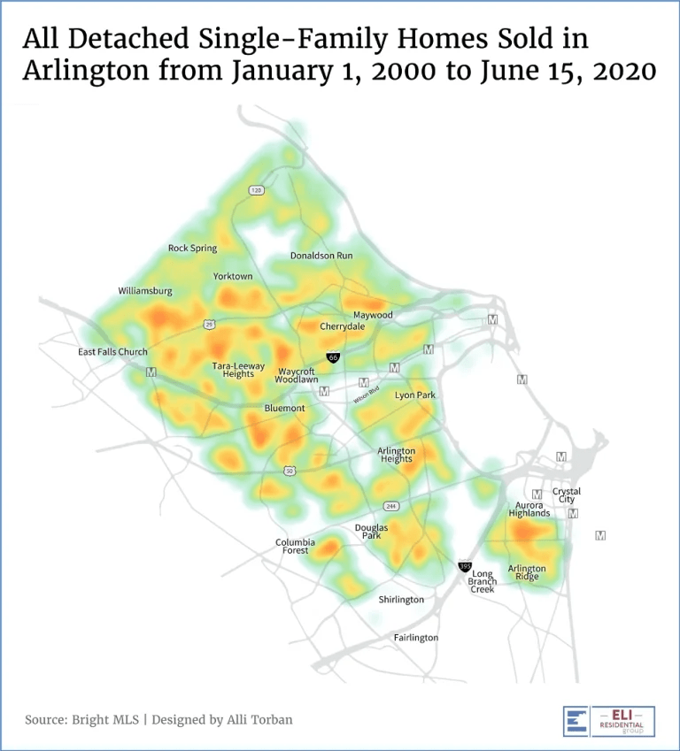 The chart below shows the Arlington neighborhoods with the most and least turnover of single-family detached homes, using the last 20 years of home sales.