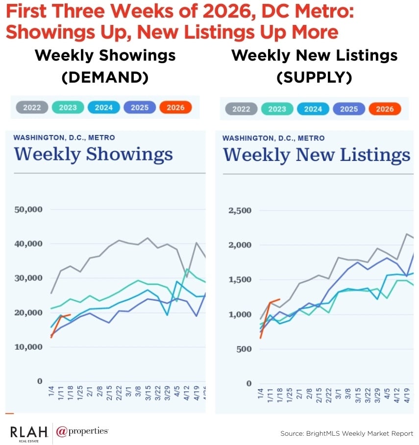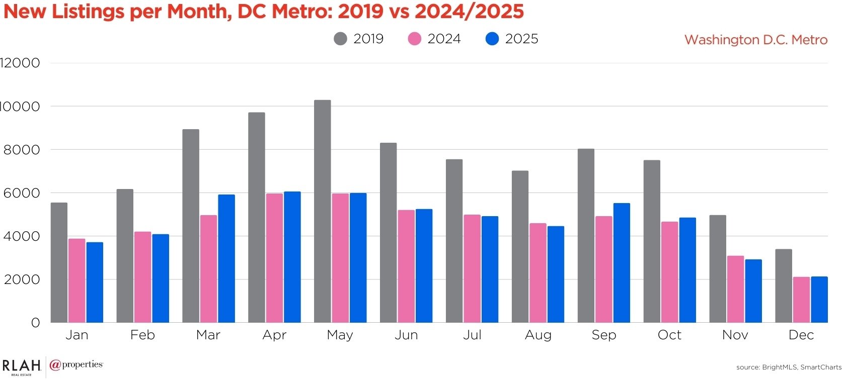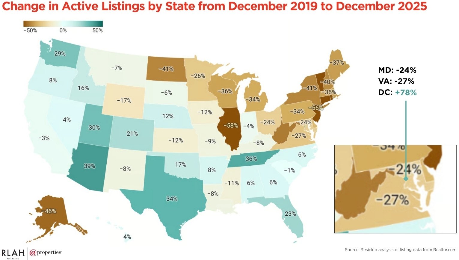 Local Data: Virginia and Maryland are had 27% and 24% fewer homes for sale in December 2025 compared to December 2019, but Washington DC’s inventory levels increased by 78% in that same period. DC’s significant inventory increase is attributed to a severe lack of demand for DC condos.