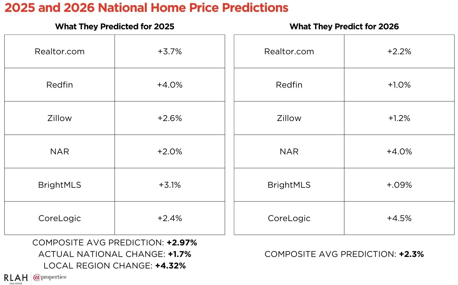 Last year, six leading housing research organizations predicted homes price appreciate of 2-4% nationally, a composite prediction of 3%. Actual appreciation in 2025 was 1.7%.