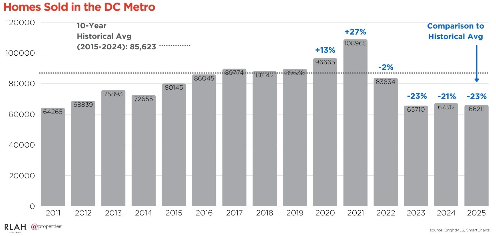 For a third year in a row, the number of homes sold in the DC Metro fell more than 20% below the ten-year historical average. This is due to a lack of homes being offered for sale, not a reflection of low demand.