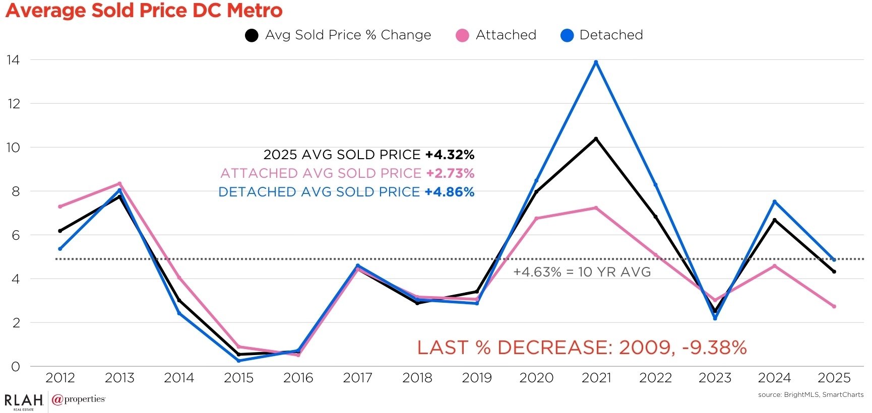 Despite local economic and political headwinds, the average home in the DC Metro in 2025 sold for 4.3% more than in 2024. There has not been a year-over-year decrease in average sold price since 2009 (down 9.4%).