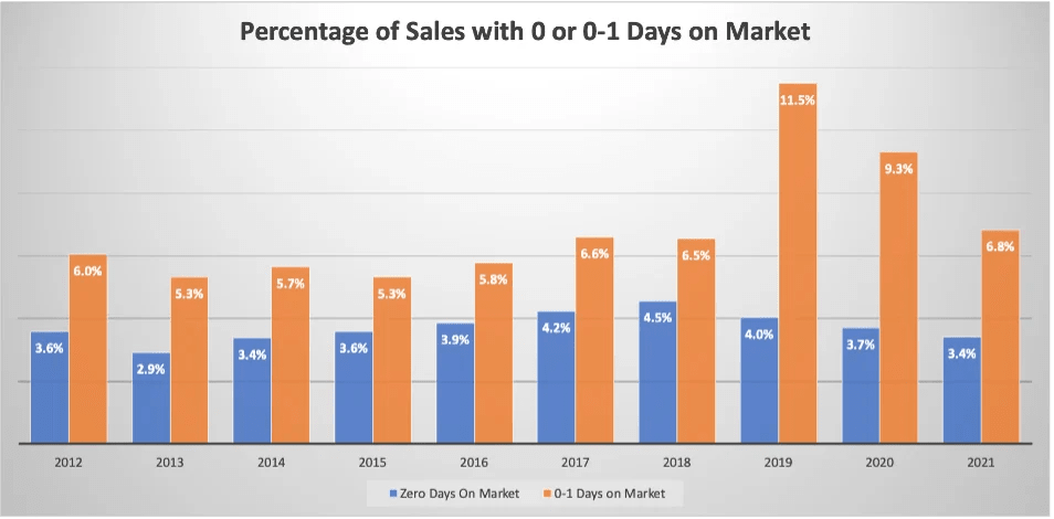 The chart below shows the percentage of homes each year that sold with zero or zero/one days on market.