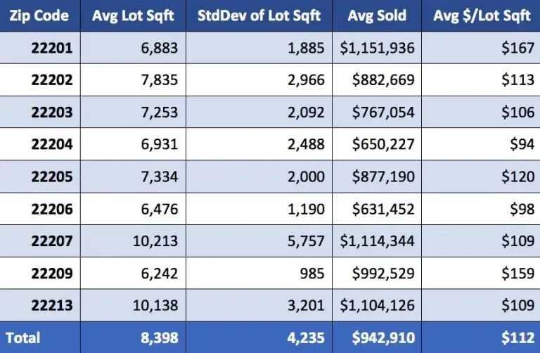 Answer: Breaking News... land is very hard to come by in Arlington. Only 11 homes sold in the last ten years had one or more acres, and it’s going to cost you over $1M to buy one. The average lot size of a single-family home in Arlington is about 8,400 sq. ft. or .19 acres with about 70% of homes on 6,000-10,000 sq. ft. lots.