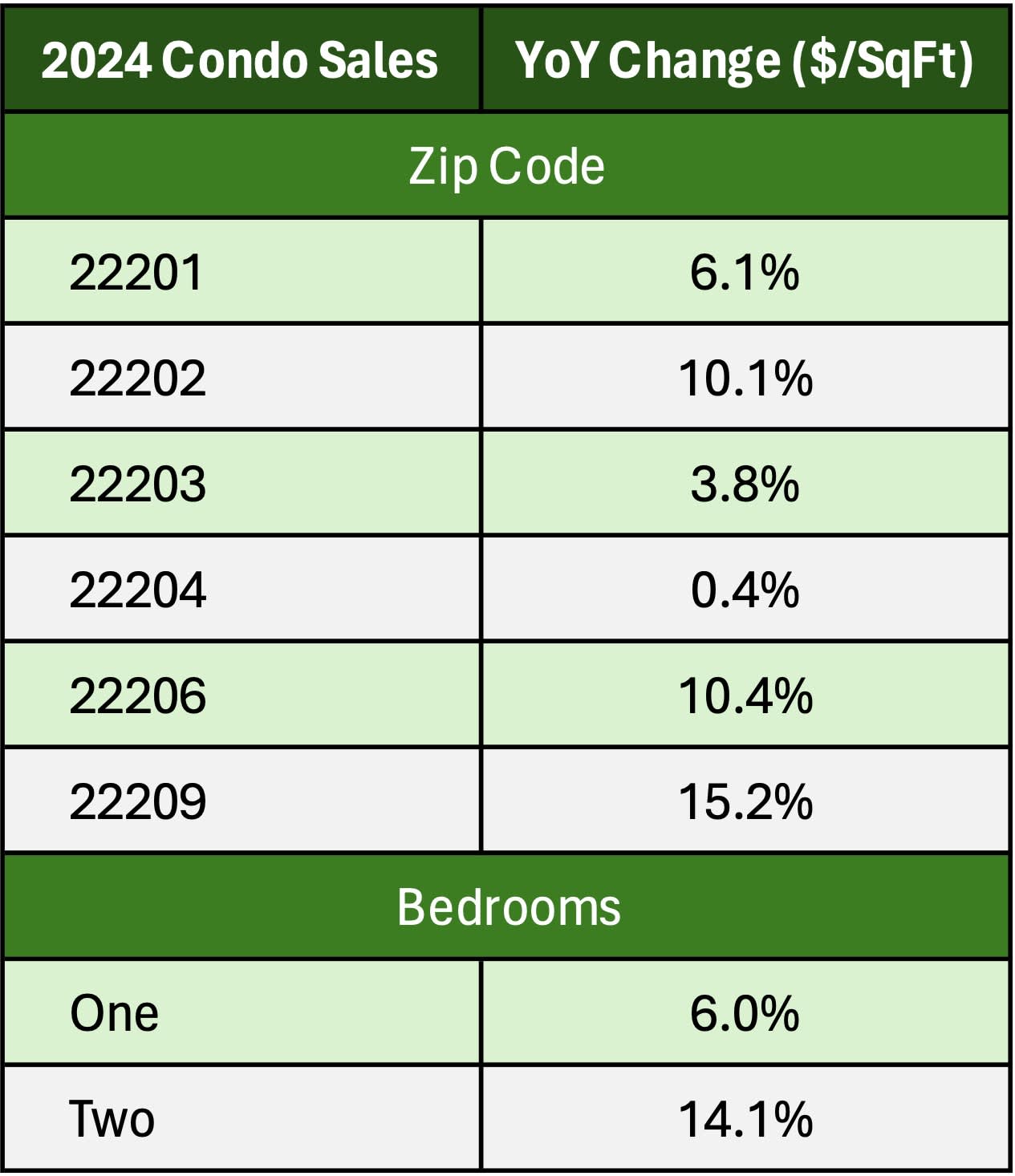- The 22209 zip code (Rosslyn area) boasted the strongest geographic growth due to it having a much higher ratio of two-bedroom condos relative to one-bedrooms units compared to the rest of the Arlington market