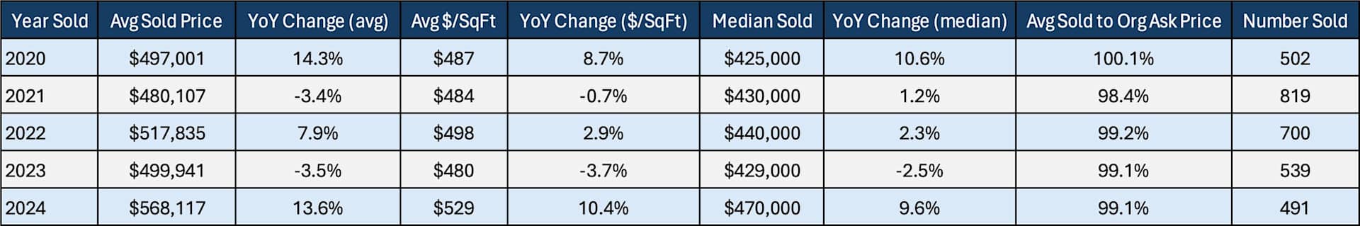 - I find price-per-square-foot to be a more accurate measure of price appreciation for condos, which shows an overall increase of 10.4% compared to 2023, with 6% growth for one-bedroom condos and an incredible 14.1% growth for two-bedroom condos