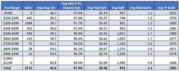 The following data summary represents apartment-style condo sales in Arlington over the last four years, broken down by condo fee ranges. Of note is that as the fee and fee per square foot increases, so does the time it takes to sell and percentage discount buyers negotiate of the asking price.