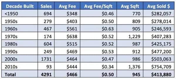 Of note is that the buildings from the 1950s and earlier have the most limited (or non-existent) amenities and there seems to be a jump in fees per square foot in buildings as they reach the 20 year mark, but leveling off after that, in-line with my expectations because most major systems require expensive repairs or replacement around the 20-30 year mark.