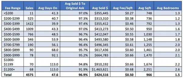 The average condo fee for a one bedroom apartment in Arlington is $397/month and $530/month for a two bedroom unit. On average, owners pay 50 cents per square foot they own. Looking at my favorite sales indicators, days on market and sold price to original ask ratio, there is a direct correlation between higher condo fees and the number of days on market, as well as between higher condo fees and greater buyer discounts from the original asking price (see first and second data tables below).