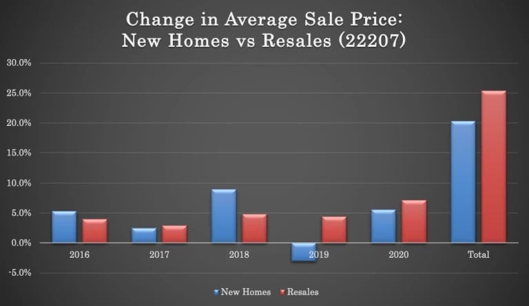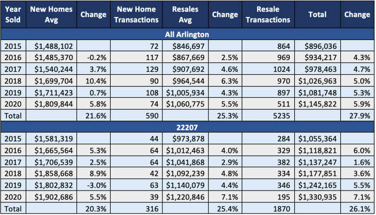 The charts below compare the annual change in the average price of a new SFD home and a resale SFD home. The first chart shows all Arlington SFD sales and the second chart is just for the 22207 zip code which accounts for 54% of all new SFD home sales since 2015.