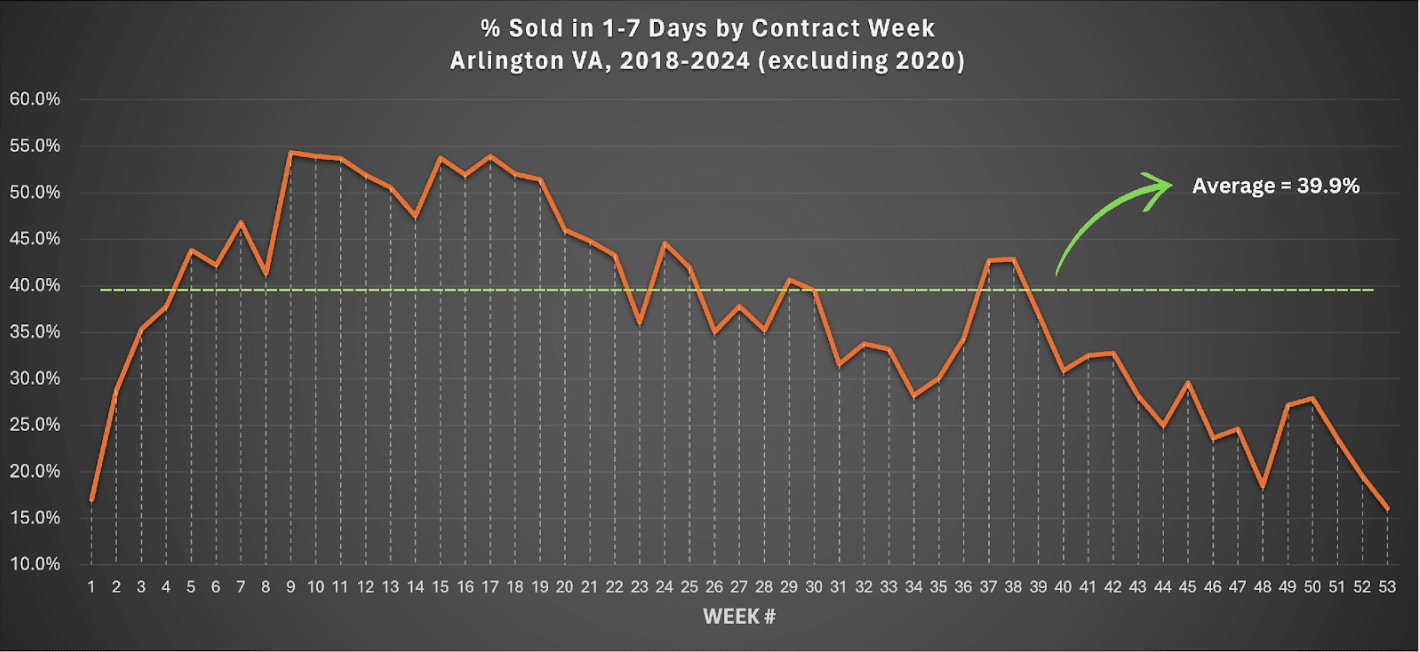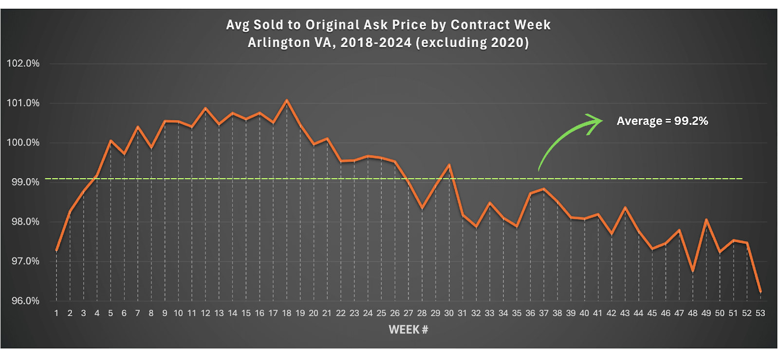 The charts below illustrate market performance/conditions based on the week a property went under contract, using my two preferred market performance metrics – the percentage of homes selling within their first week on market (pace of the market) and the average sold price to the original asking price (price pressure). You can see that both measures follow similar trend lines during the year. Note: I did not include 2020 because the seasonality was reversed due to COVID lockdowns.