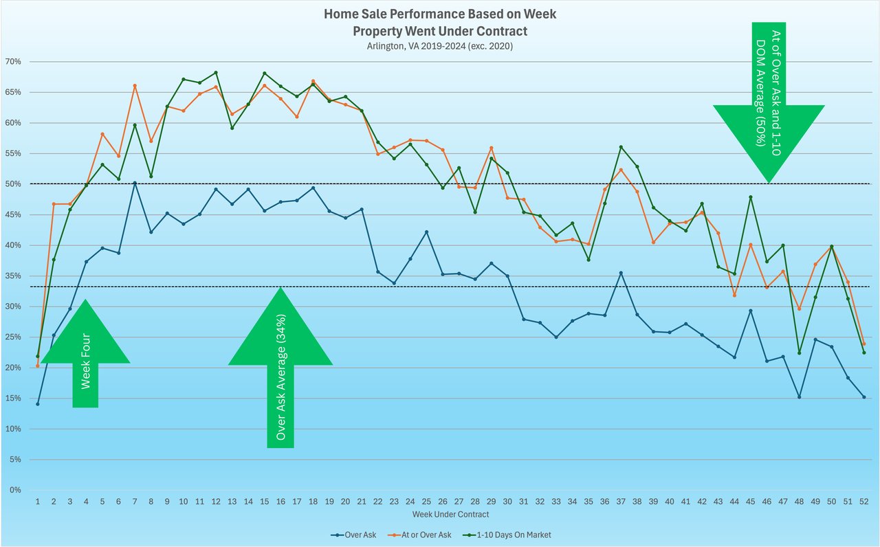 The data in the chart below is collected from Arlington sales going back to 2019, sans 2020 data and new construction. It shows market performance based on the week that properties go under contract based on the percentage of properties selling over the original ask, the percentage of properties selling at or over the original ask, and the percentage of properties selling within ten days on the market (my preferred measure of market speed).