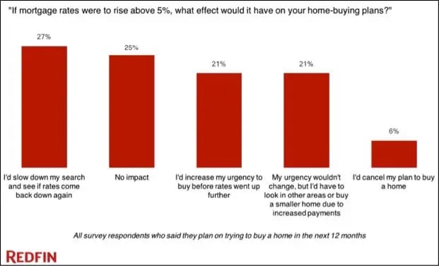 Redfin recently asked 4,000 buyers who planned to purchase in the next 12 months how increasing rates would impact their purchase and found that only 6% would cancel their plans to buy while nearly 50% wouldn’t change anything or would increase their urgency to buy.