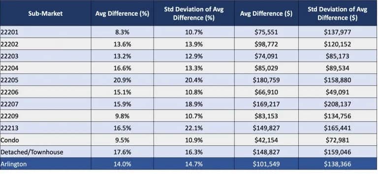 Homeowners in the 22205 zip code benefit the most by underassessments with an average difference between 2021 sold prices and their assessments of 20.9%, or nearly $181,000. Owners of single-family homes and townhouses (17.6% average difference) benefit more from underassessments than condo owners (9.5% average difference).