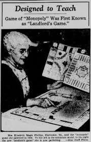 In the 1880s, Magie found her way to D.C. from Illinois pursuing a career as a stenographer and typist. During this time, Magie also patented her first invention– a machine part that helped papers move smoothly through typewriter rollers. By the end of the century, this young inventor became increasingly interested in anti-monopolist theories. Specifically, she admired Henry George, who believed that a “single tax” on land value should fund all government projects. This would shift the tax burden to landlords. Magie’s strong stance inspired her to create an educational game for her friends & colleagues on her adopted theory on land monopolies.