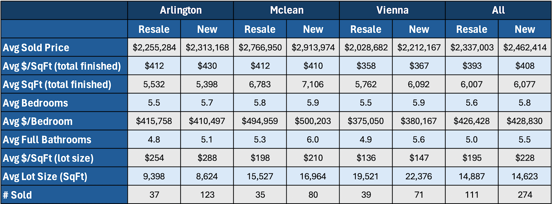 The data set below looks at sales since Jan 2023 of new (never lived in) construction homes vs the resale of homes built in the last ten years in Arlington, Mclean, and Vienna. I removed some of the outliers by size and limited the data to homes with 4,000-9,000 total finished square feet. The average resale home in this data set was built in 2017.