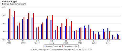 The easiest way to explain why we’re seeing such fierce competition and price appreciation is the Months of Supply (MoS) chart. MoS is a measure of supply and demand, showing how long the current inventory would last, based on the existing pace of sales. Fairfax Co and Arlington had just two and three weeks of supply, respectively, in the first quarter. Six months of supply is what economists say is needed for a well-balanced market.