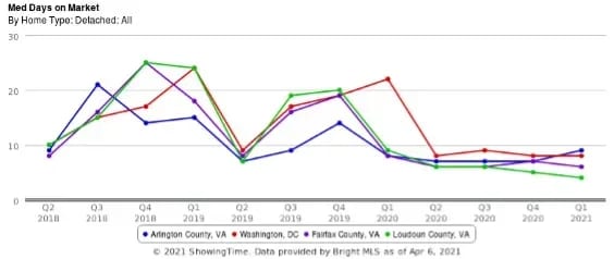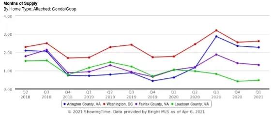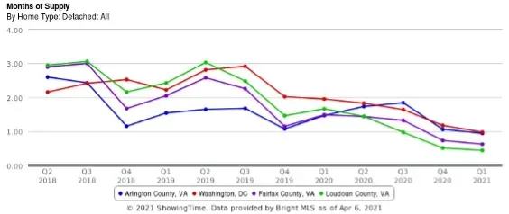 In 2018 and most of 2019, Months of Supply for SFH in Washington DC, Fairfax County, and Loudoun County was 2-3x higher than Arlington (indicating a more favorable market for buyers). In Q1 2021, Fairfax County and Loudoun County had about half the Months of Supply as Arlington and Washington DC, clearly a sign of buyer preferences for more space, lower $/SqFt, and de-prioritization of commute time and walkability.
