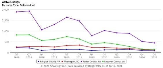 Fairfax County stands out for the huge drop in active SFH home listings, dropping from an average of nearly 2,000 listings/quarter in 2018 to less than 500 in Q1 2021.