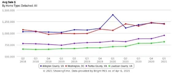The data suggests relatively little change in average prices in Q1 2021 in Arlington and Washington DC, but I think this is more about the data composition than a reflection of actual pricing because everything I’ve experienced in the market suggests strong price growth in Q1 2021.
