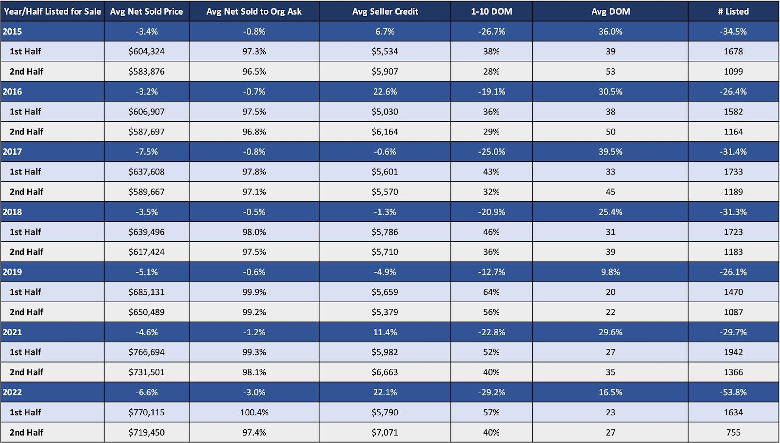 The data is based on when a property was listed (first half or second half of the year), not when it closed, so we can have a true indication of market metrics based on when a property hits the market