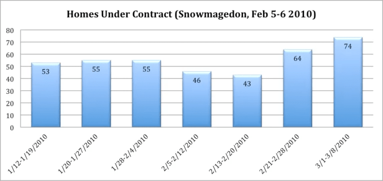 During Snowmagedon Feb 5-6 2010, we got about 18 inches of snow. Here’s a look at the number of homes that went under contract before, during, and after that period. It took about 2 weeks for activity to pick back up to “normal” levels.