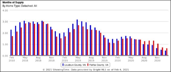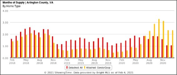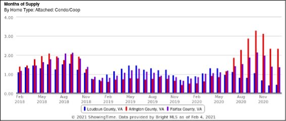 The condo market worsened monthly from about June 2020 – November 2020, but reversed course a bit in December and remained slightly improved in January. I see the condo market picking back up at a slow pace and likely to continue improving through the spring, as demand hopefully/probably picks up, but I don’t see a return to the pre-COVID condo market any time soon.Let’s take a look at some key charts for Arlington and Northern VA (Fairfax and Loudoun County)…Arlington Months of Supply