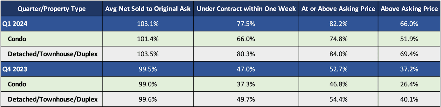The average home that has been listed and sold in Q1 sold for 3.1% over the original asking price, even the average condo is selling for 1.4% over the asking price
