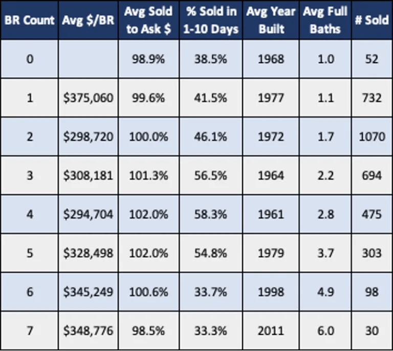 The data suggests that 4BR homes are the most in-demand, followed closely by 3BR and 5BR, and for good reason…4BR homes have the best cost per bedroom of any size home