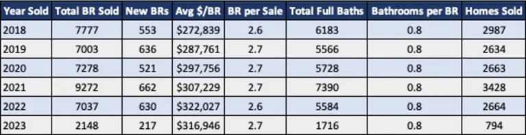 Over the past five years, an average of 7,673 bedrooms have sold each year. 56% of bedrooms sold are in single-family homes, 25% in condos, and 19% in townhouse/duplex properties.