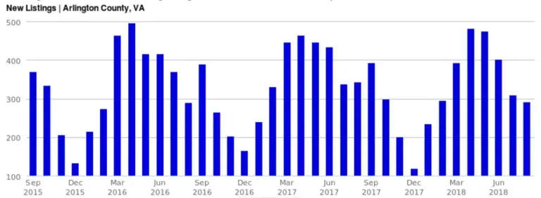 Chart #1: The chart below shows the number of newly listed homes for sale in Arlington each month, going back the last three years