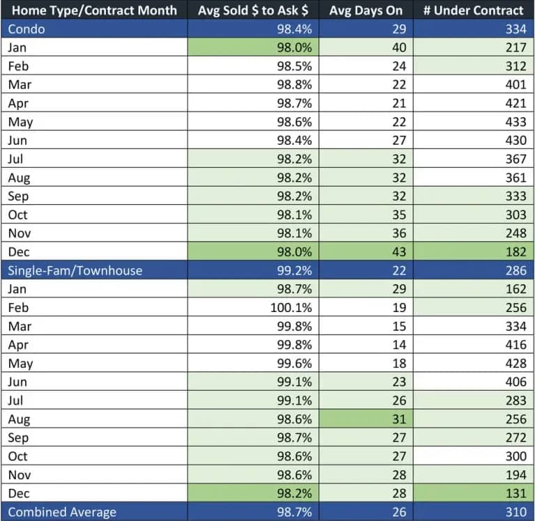 Table #1: The table below is made up of Arlington home sales from 2015-2017, excluding new construction and anything that took more than 120 days to sell. I have highlighted the cells in green that are the most favorable for buyers. The table is based on the month that a sold home went under contract, not the month it actually sold (homes usually sell 30-60 days after they go under contract).