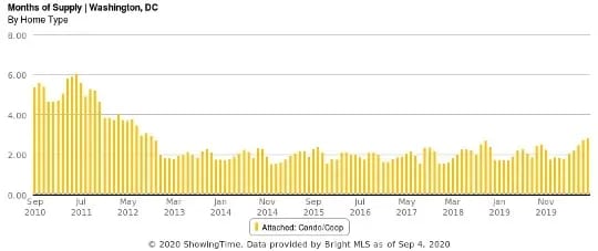 The rest of Northern VA also experienced an increase in condo supply in July and August, but not nearly to the extent of Arlington. Absorption (demand) has also remained pretty close to the strong numbers seen since January 2019. As a result, Months of Supply for the entire Northern VA condo market has increased slightly over the last two months and fits normal seasonal patterns.What About Washington, D.C.?