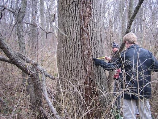 (A Champion Ash tree in Barcroft Park being measured, Photo: Arlington County)