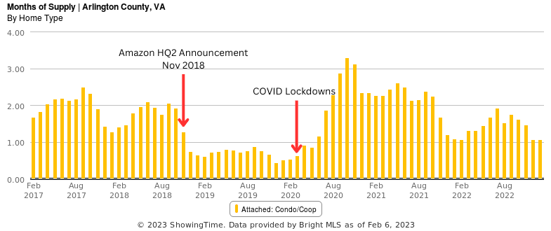 I guess that the HQ2 pause will lower long-term appreciation (which is historically pretty low) for Arlington condos until we find out Phase 2 (development and hiring) is back on track, but I do not think we’ll see a near/mid-term drop in prices undoing the sharp increase after HQ2 was announced. The exception to this is the 22202 zip code of Pentagon/Crystal City (aka National Landing), where HQ2 is based, which might see condo prices slide slightly in 2023 because of the news.