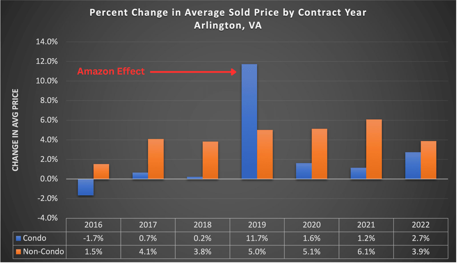 The Amazon effect was massive when Amazon announced its intention to build its second headquarters in Arlington VA on November 13, 2018. The condo market went from a multi-year annualized appreciation of less than 1% to an 11.7% increase in 2019, which was only slowed by COVID lockdowns in March 2020.