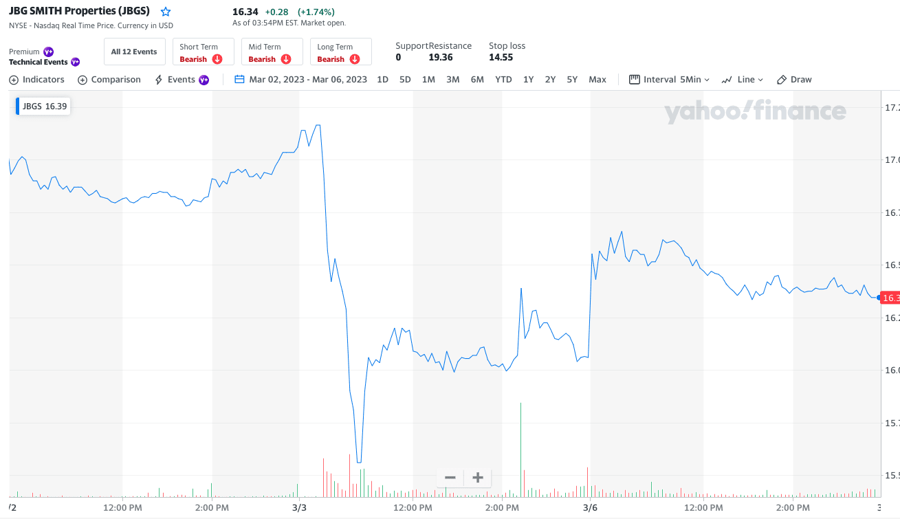 This should probably look something like the JBG Smith (Amazon’s development partner) stock price, shown below, which dropped about 8% on Friday, after Amazon announced they were pausing HQ2, and has recovered about half of that price drop since, finishing Monday down just under 5% from Friday’s pre-announcement price.