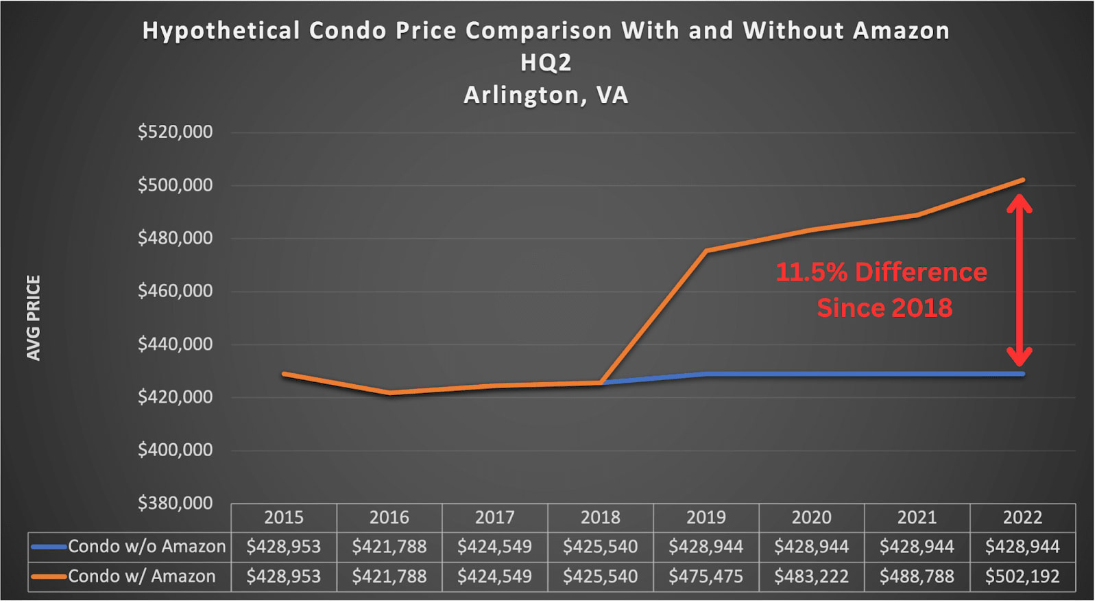 Just for fun, I compared the difference in average condo prices if you replace the 2019 HQ2-driven “speculative” gains with the average annual appreciation of the Arlington condo market for the three years before and after (0.8%) and keep the actual 2020-2022 gains. In this hypothetical world where Amazon doesn’t choose Arlington for HQ2, condo prices would be 11.5% below their current levels.